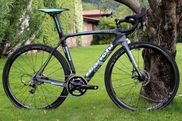 Bianchi have overhauled their range for model year 2014, with 80 per cent of the collection updated, including the introduction of the all-new Intenso, but it was the Oltre XR2 Disc that caught the eye at the firm’s presentation in northern Italy. It is, along with the Colnago C59 Disc, one of only a few disc-equipped race machines.