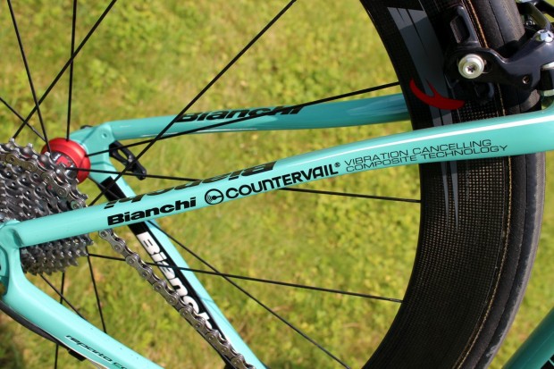 The frame uses what Bianchi call Countervail technology to cancel road vibrations. Countervail was developed by Bianchi in conjunction with the Materials Sciences Corporation in the United States and viscoelastic material has been embedded into carbon layup. Bianchi are keen to stress the Countervail technology cancels vibrations before they reach the rider, rather than merely dampening them.