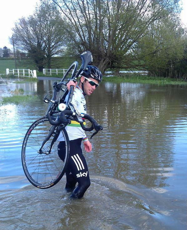 Flood water forces Mark Cavendish to shoulder the bike and wade in...