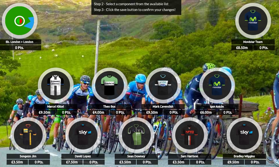 You also need to pick a bonus team and a bonus stage – your team will not start scoring points until you have selected and saved nine riders, a team and a stage.