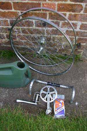 A trawl through Shropshire’s cycle shops revealed news of Spokes, a bicycle recycling charity in Kidderminster, which turned out to be a treasure trove of new and used parts. With the exception of the tyres, which were bought new, the whole bicycle, including trick parts [which ones were they, then? – ed.] cost under the £25 price cap.