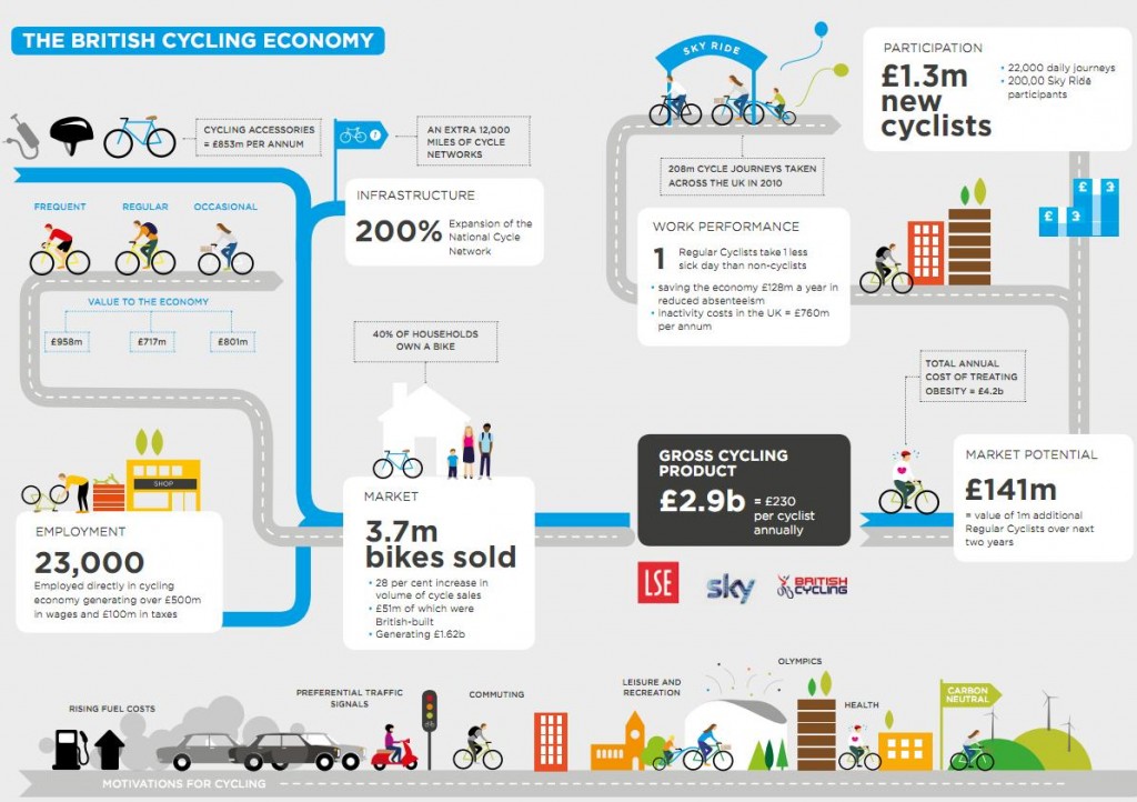 The report, commissioned by Sky and British Cycling, says that, on average, regular cyclists take 7.4 sick days per year, compared with 8.7 sick days for non-cyclists, saving employers £128m per year, and a projected £2bn over the next 10 years.