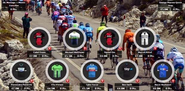With eight transfers available per week there’s plenty of scope for change. If BMC Racing are unable to deliver Cadel Evans or Daniel Oss into the pink jersey they will be among my first changes, with Giant-Shimano’s Luka Mezgec looking great value at just €3.0m.