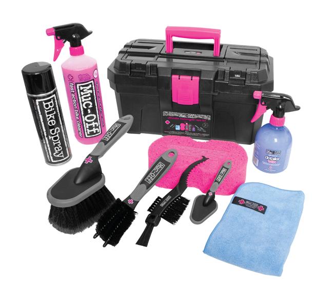 The kit contains bike cleaner (1 litre), bike spray (500ml), wet lube (50ml), drivetrain cleaner (250ml) – all of which are biodegradable – plus a microfibre cloth, detailing brush, soft washing brush, two prong brush, claw brush and microcell sponge, all kept in a heavy duty storage box.