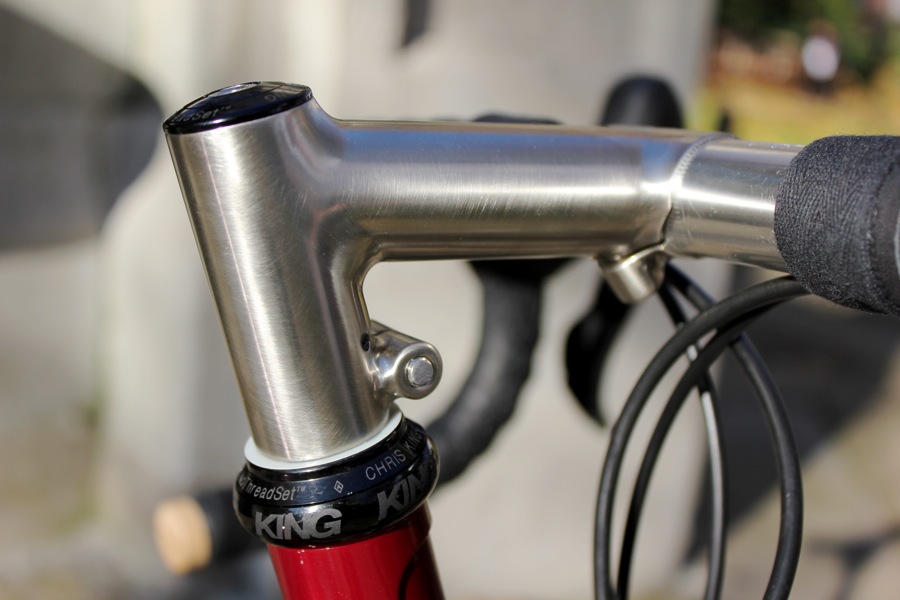 The star of the finishing kit, however, and perhaps even the bike, is the beautiful handmade handlebar stem, one fashioned from 4130 steel, nickel plated, and given a brushed finish.