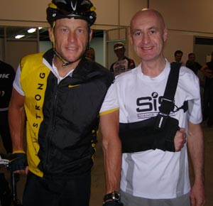 Disaster struck Lance Armstrong’s comeback campaign recently when he broke his collarbone in a fall during the the Vuelta Castilla y Leon, offering RCUK readers the chance to think up a second caption to a pic of the Texan with SIS director and fellow collar bone breakee Pete Slater.