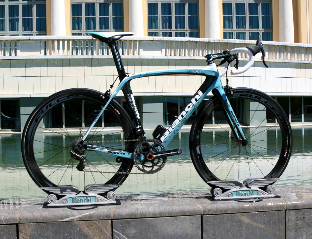 The weight reduction and improved stiffness are achieved with a combination of ‘Ultra High Modulus carbon fibres’ labelled UMS40 and CN60. Other features on the monocoque frame include a BB30 bottom bracket, a massive downtube and chainstays, a tapered headtube (1 1/8″ – 1.5″), internal cable routing, and Bianchi’s Ultra Thin seat stays.