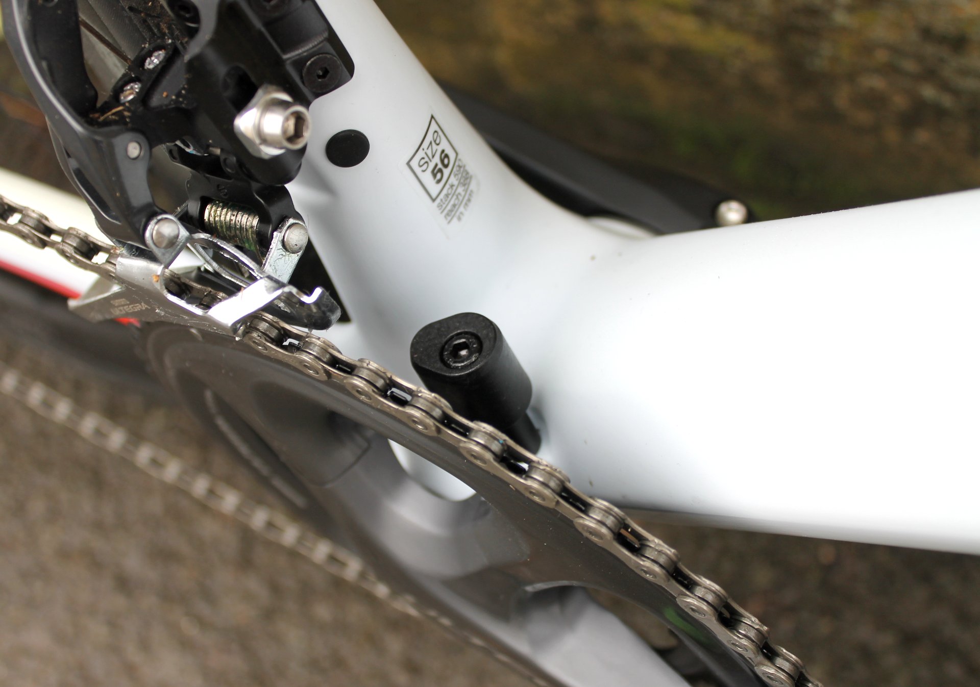 The carbon layup is complemented by a distinctive rear triangle, with the seatstays narrowed and flattened, with the junction to the seattube made almost a third of the way down the frame – visibly lower than the vast majority of bikes. As a result, this ‘Angle Compliance Shaping’ allows the seatstays and tube to flex under duress, without loss in feel or responsiveness through the rear end.