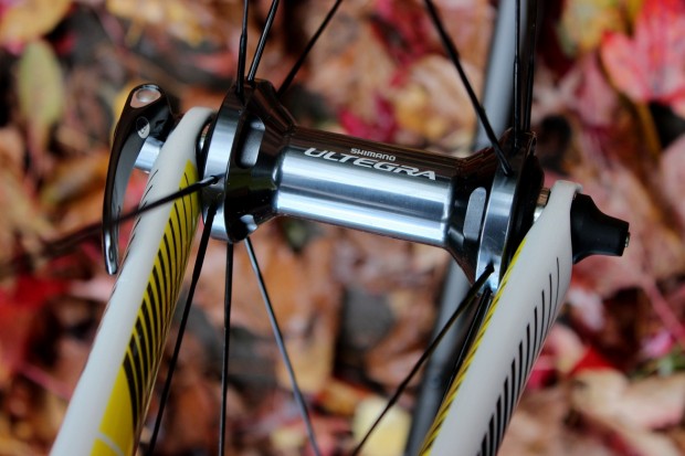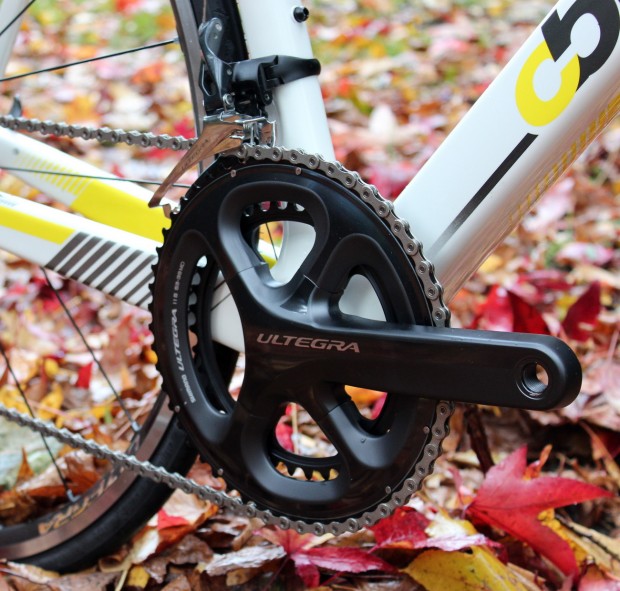 The new Ultegra delivers much of the performance of the top-tier Dura-Ace setup and is a joy to ride with. The smaller hoods feel more comfortable under hand – to this reviewer, at least – and the lever action is incredibly light and smooth, with an efficiency which can only be expected of Shimano. The chainset uses the same, four-arm design as Dura-Ace 9000, which is said to maintain stiffness while reducing weight, and Shimano claim the dual pivot brakes produce a claimed ten per cent improvement in power over the previous generation Ultegra 6700 stoppers. We found that the brake pads took a little while to bed in but, once they had, braking was powerful and consistent.