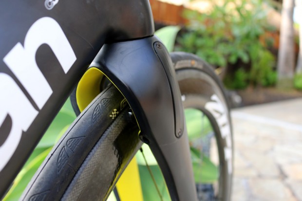 Most striking is the fully-integrated front-end (the stem flows cleanly into the toptube), a trend we’ve seen established by bikes including the Pinarello Bolide and Ridley Dean FAST, while the front brake has been integrated into the fork blades in, aesthethically at least, a similar design to the LOOK 695 AeroLight.