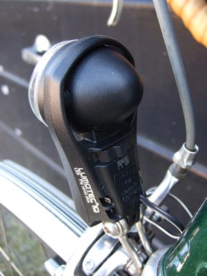 Controlling the LED is a three-position switch offering on, off and auto modes. Auto, the interesting one, is the ‘Senso’ part; the lamp contains a light sensor that automatically illuminates any time ambient light is insufficient. The IQ is designed to be used either on its own or wired up to a rear light, in which case both front and rear lights will start up if external light levels fall. The ‘Plus’ bit denotes the provision of a condenser inside the lamp that holds enough capacity to provide about three minutes’ low-powered lighting after only a few minutes riding.