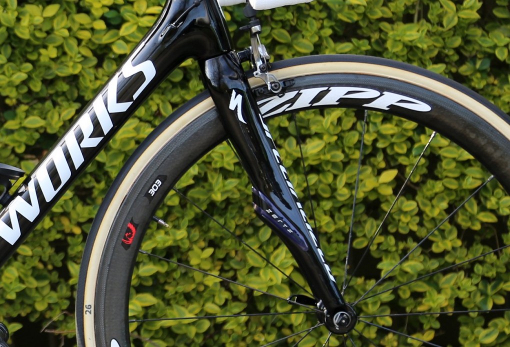 The Zertz inserts on the fork and chainstays are the stand-out feature on Spesh’s bike for the cobbles and said to improve comfort. The frame is now on its fourth iteration and is a machine on which Tom Boonen has won the Hell of the North.