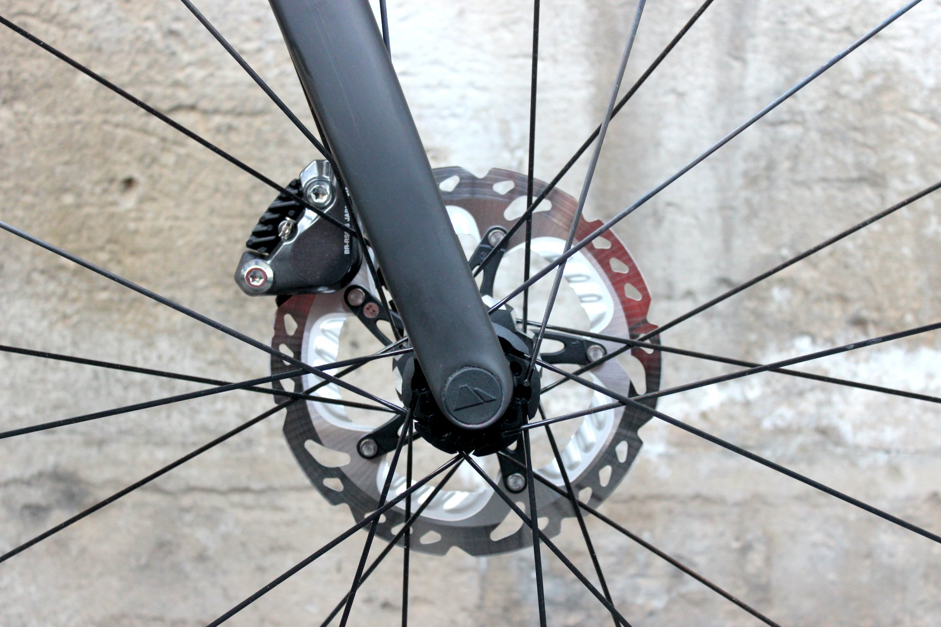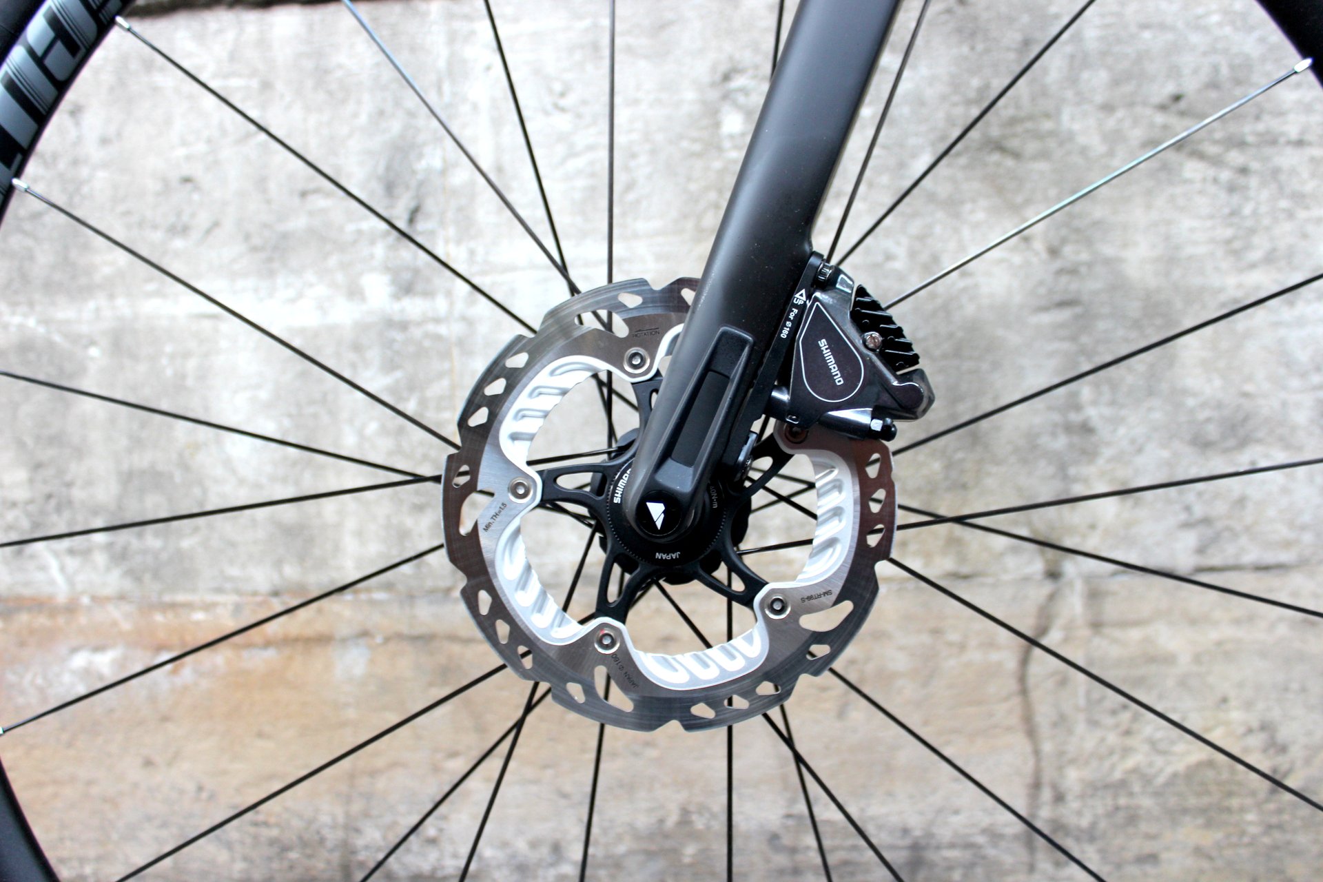 That tyre clearance comes partly from the fact the Endurace is a disc-equipped machine. Canyon have adopted the now ubiquitous flat mount standard to attach the Shimano disc brake calipers to the frame, with 12mm thru-axles at the front and rear to add a little extra security and stiffness to the braking interface.