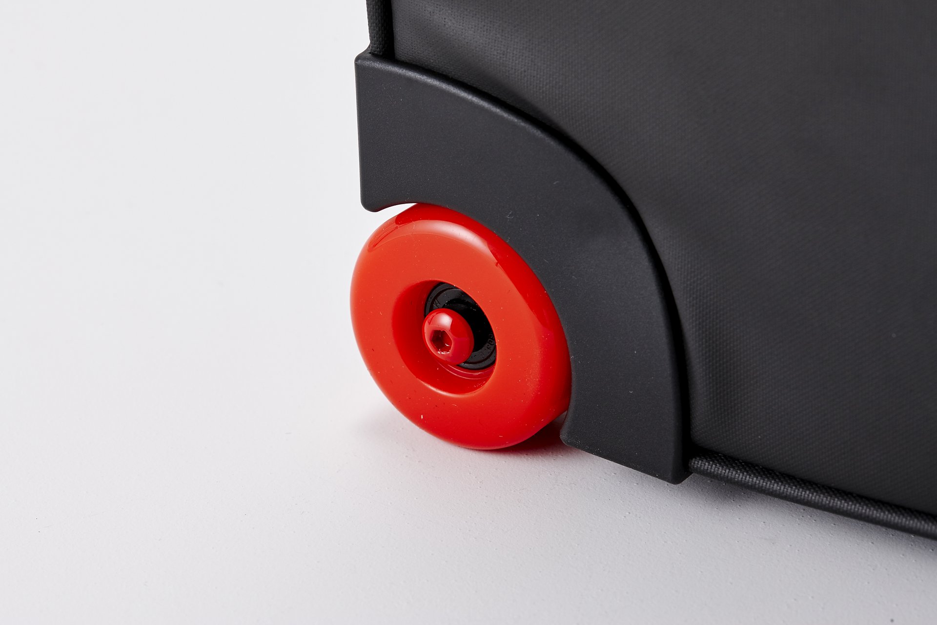 That dark overall look is highlighted very nicely by smooth-rolling red wheels and a sturdy metallic red telescoping handle, which only becomes visible when you extend it.