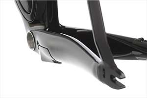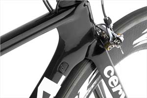 To go faster than the P3, Cervelo has headed down the integration route, developing a custom fork that fits seamlessly into the head and downtube. Up top, custom headset spacers create a smooth transition to the 3T Ventus tri-bar. Towards the rear, Cervelo has moved the rear brake from the seat stays to a position behind the bottom bracket, concealing the caliper entirely in the chainstays, removing it entirely from the passage of air. Furthermore, Cervelo claim their own design caliper is 30% lighter thtan Dura-Ace, while offering the same level of power and modulation.