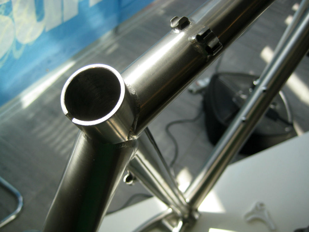 We spotted the Freezer Ti at Cycling Sports Group’s (Charge’s UK distributor) dealer show at Mercedes-Benz World in Surrey. Besides the space age dropouts, neat touches include the toptube-mounted cables (so you don’t snag the cables when shouldering the bike) and wishbone seatstays, above which there’s a large area which is easy to grab (again when running with the bike in a ‘cross race). The frame will eventually have a tapered head tube, unlike the prototype we photographed.