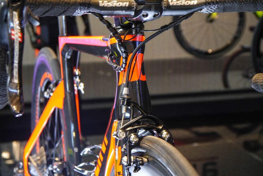 Never lacking in confidence, Cipollini describe the NK1K as the ‘revolution over two wheels’, and the bike’s monocoque frame is made from top-end Toray T1000 carbon, as is the matching fork. Frame weight is on the heavier side, in line with the rest of the Cipollini range, at 1,120g for an unpainted medium.