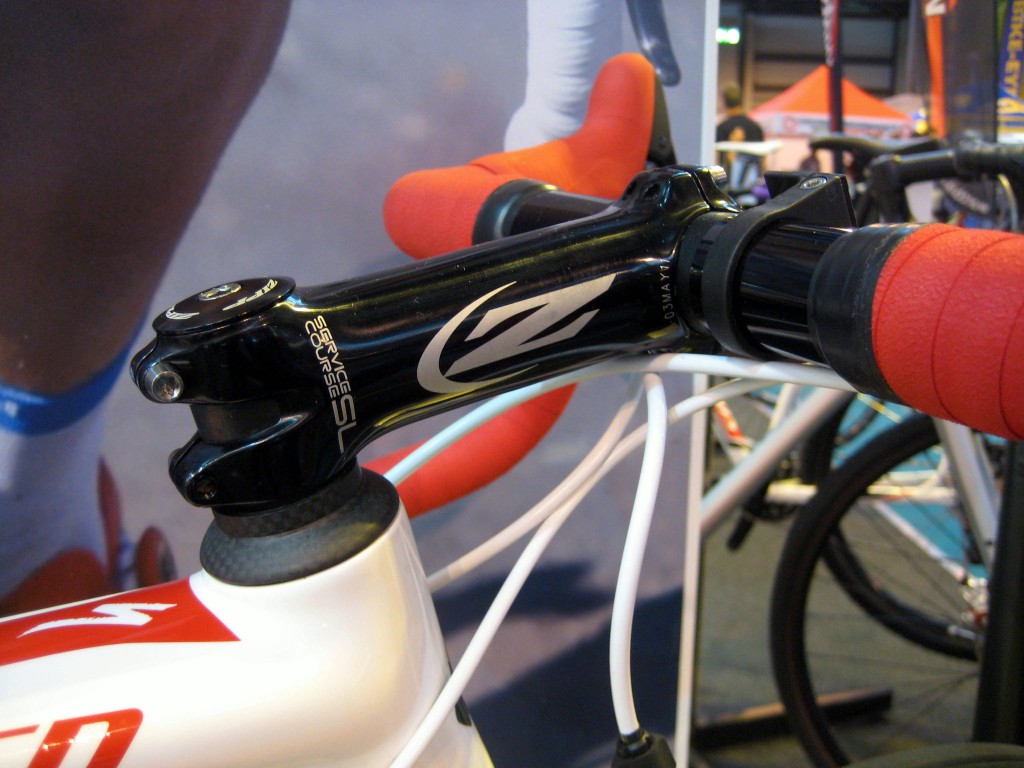 Low and long: Contador’s Zipp Service SL4 stem has the signature pro look, slammed onto the headset, while double handlebar tape provides extra cushioning for Contador’s hands