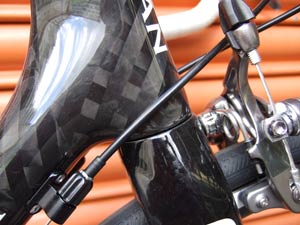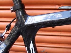 The frame comes in four sizes – all with sloping geometry – with head and seat tube angles changing to suit the proportions of smaller and larger bodies. Our test bike is one notch down from the biggest. It’s denoted a “52cm”, which sounds tiny due to the shortened seat tube of the sloping design, but it actually has an equivalent top tube length of 57cm. Head and seat tube angles are both a sporty but sensible 73°. Happily it was specced with 175mm cranks, and a ‘proper’ 53/39 racing chainset, which suggested to us that the Mythos had been set up, if not constructed to go fast.