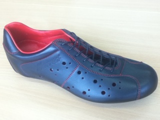 The shoes pictured here, hand made in Italy, are the Race model, which feature a leather upper and nylon sole drilled for a three-point, LOOK-friendly attachment.