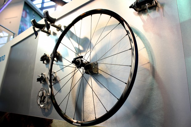 The Shimano WH-RX31 road disc wheel, one of several Shimano products placed before the public for the first time at Eurobike