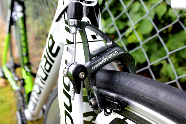 Our SRAM Force 22 groupset will include hydraulic rim brakes, but our Fredrichshafen machine was equipped with standard mechanical offerings. Hydraulics have dominated the brake ‘conversation’, whether it be rim or disc, for what feels like an eternity so it’s perhaps worth flagging up here that modern cable-operated rim brakes offer a highly efficient stopping mechanism.