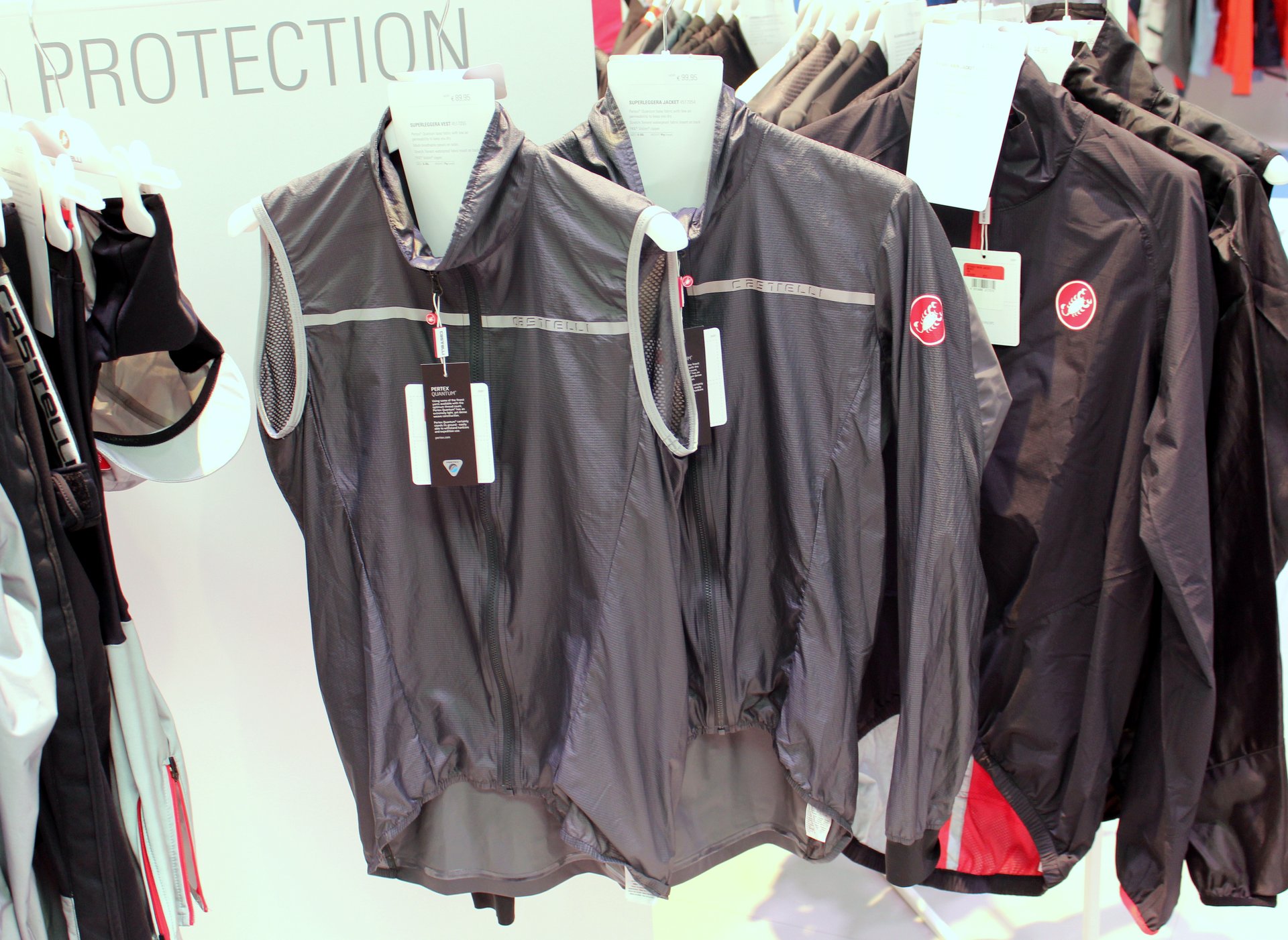 Otherwise, the Superleggera jacket (€99.95) and Superleggera vest (€89.95) are also new from Castelli. They’re made from a Pertex Quantum fabric which is windproof and incredibly light. Unlike Dyneema, the Pertex fabric doesn’t offer any significant waterproofing, though both do have a waterproof fabric insert on the back to offer some protection from rain and, more significantly, wheel spray. Still, think of the Superleggera range as kit to wear on a mountain descent or when there’s a morning chill in the air, but otherwise is likely to be stuffed in a pocket meaning low weight is important.