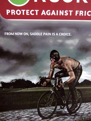 Both feature Belgian pave, but while the BioRacer poster contents itself with a shot of several black-clad roadies towing a chariot with whip-wielding driver over the cobbles, Reskin’s picture is of a sado-masochist in full regalia enjoying the questionable benefits of pave therapy. Apparently it has been rejected by church-owned publications in some countries.