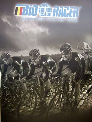 Belgian clothing specialist BioRacer may have had a new synthetic shorts insert to show off, but the most interesting aspect of the company’s stand was the latest advertising material for BioRacer and its skin protection offshoot, Reskin.