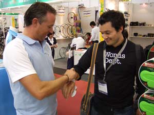 Meanwhile, on the Ridley stand, where Belgian Trappist beer was on tap at the Thursday evening party, the Helium and Noah models both boasted mild revisions for next year. With the Helium now firmly established as Ridley’s climbing bike of choice thanks to excellent mountain performances in the Tour by Cadel Evans, the Noah has been made stiffer to suit sprinters such as Robbie McEwen through a rethink of the carbon fibre layup around the bottom bracket. There’s a small weight saving as well, so who’s complaining?