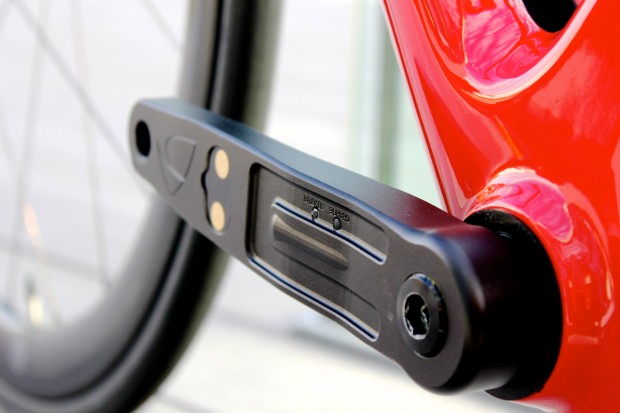 BMC-style, shallow seatstays join the seattube some 90mm below its top, and are noticeably curved. Their most interesting aspect, however, is the vast clearance offered either side of the tyre, presumably to smooth airflow, removing turbulence and its inevitable consequence: drag.