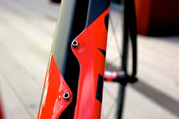 Viewed from the front, the paper-thin blades form a giant void around the wheel, not unlike the design employed by Wilier for its TwinFoil time trial bike, and which will presumably serve a similar purpose here: to allow air to flow unhindered around the leading edge of the bike. Interestingly, it’s the one area of the bike that prevented the Vis Vires from gaining the UCI’s seal of approval. The trailing edge of each fork leg has a recess at the top that provides a shielded home for an integrated TRP TTV carbon v-brake, mirroring the design of the chainstay.
