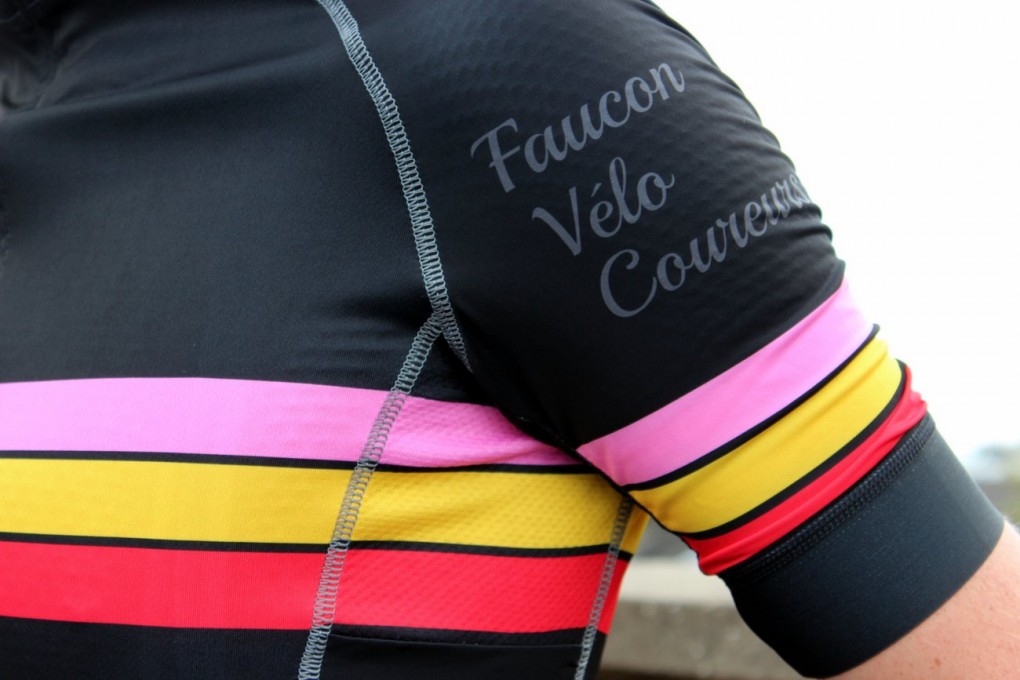 Faucon is French for falcon and the company’s logo – a falcon’s head – features on the right arm, on the back of the jersey and inside the collar. The words ‘Faucon Vélo Coureurs’ are written on the left arm.