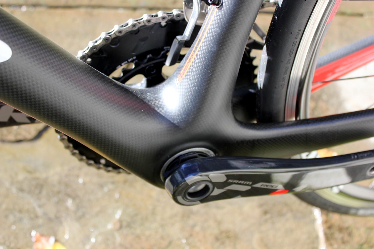The fork is a 100 per cent carbon fibre affair, with a 1 1/8in to 1 1/2in tapered steerer. Out back, the deep chainstays kick up to create an elbow joint at the rear dropouts , out of which rise the seatstays. Otherwise, there’s a BB30 bottom bracket and internal cable routing throughout.