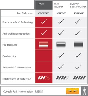 Cytech’s chamois’ – leaders in pad technology and used by top-end brands such as Assos – feature throughout the range. These particular tights use the comfortable Race pad, although, as to be expected for a cheaper piece, it doesn’t offer the same protection as more expensive tights in the range. See the graphic to the left.