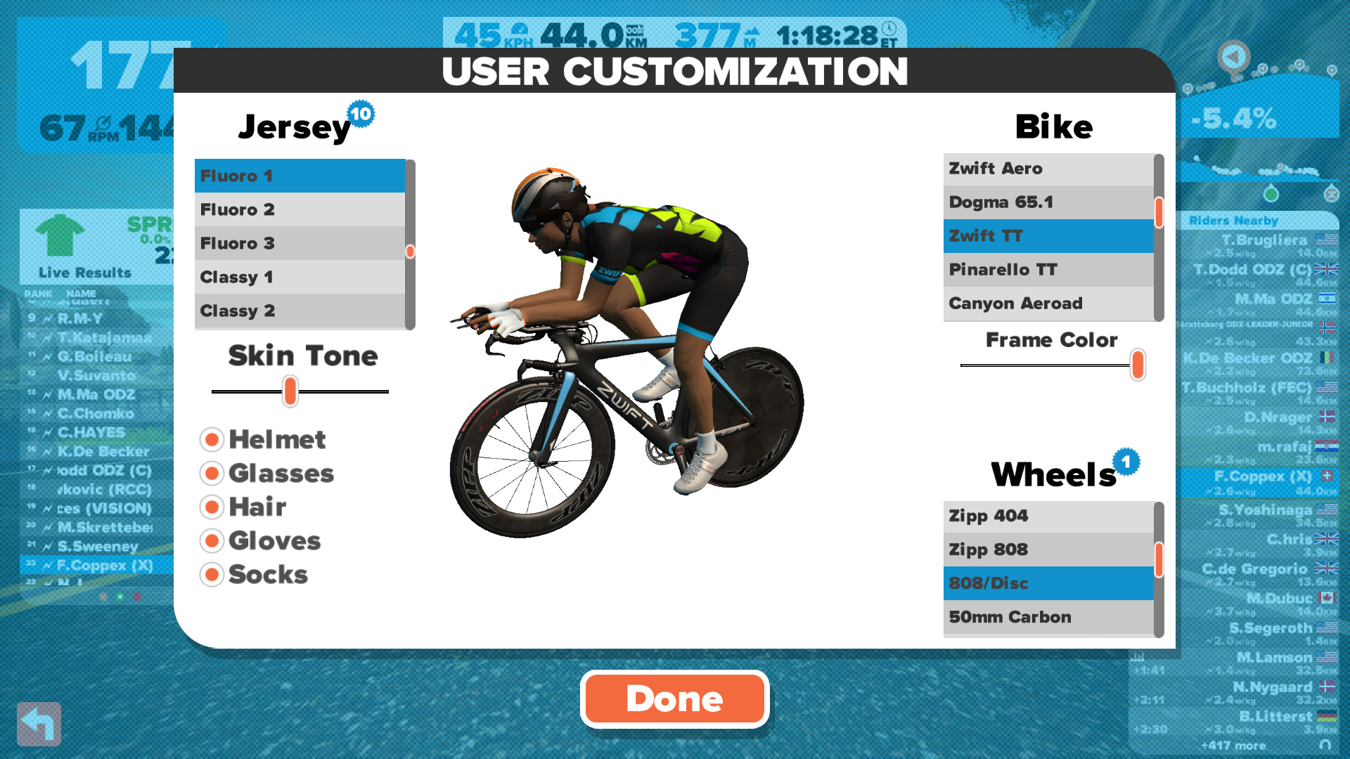 Zwift allows users to customisation their online ‘player’, down to the jersey they are wearing and their skin tone