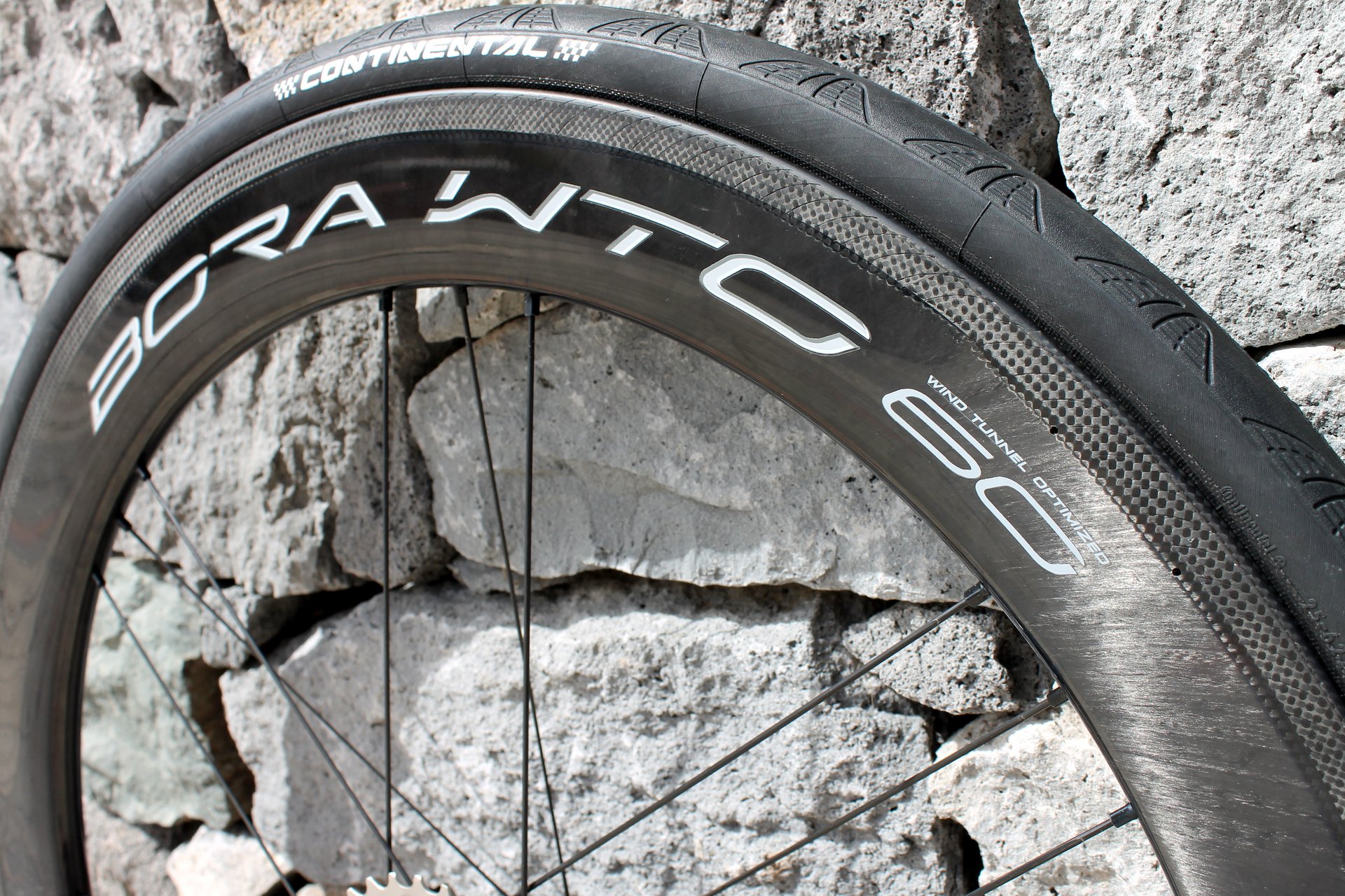 Of course, weight has been addressed, too. Thanks to a carbon inner construction with a unidirectional carbon ‘skin’ for added strength, the Bora 60 WTO wheelset weighs 670g and 880g front and rear, for a complete weight of 1,530g. The 77 WTO front wheels comes in at a claimed 745g. That’s competitive against rivals from Zipp, Hed and DT Swiss.