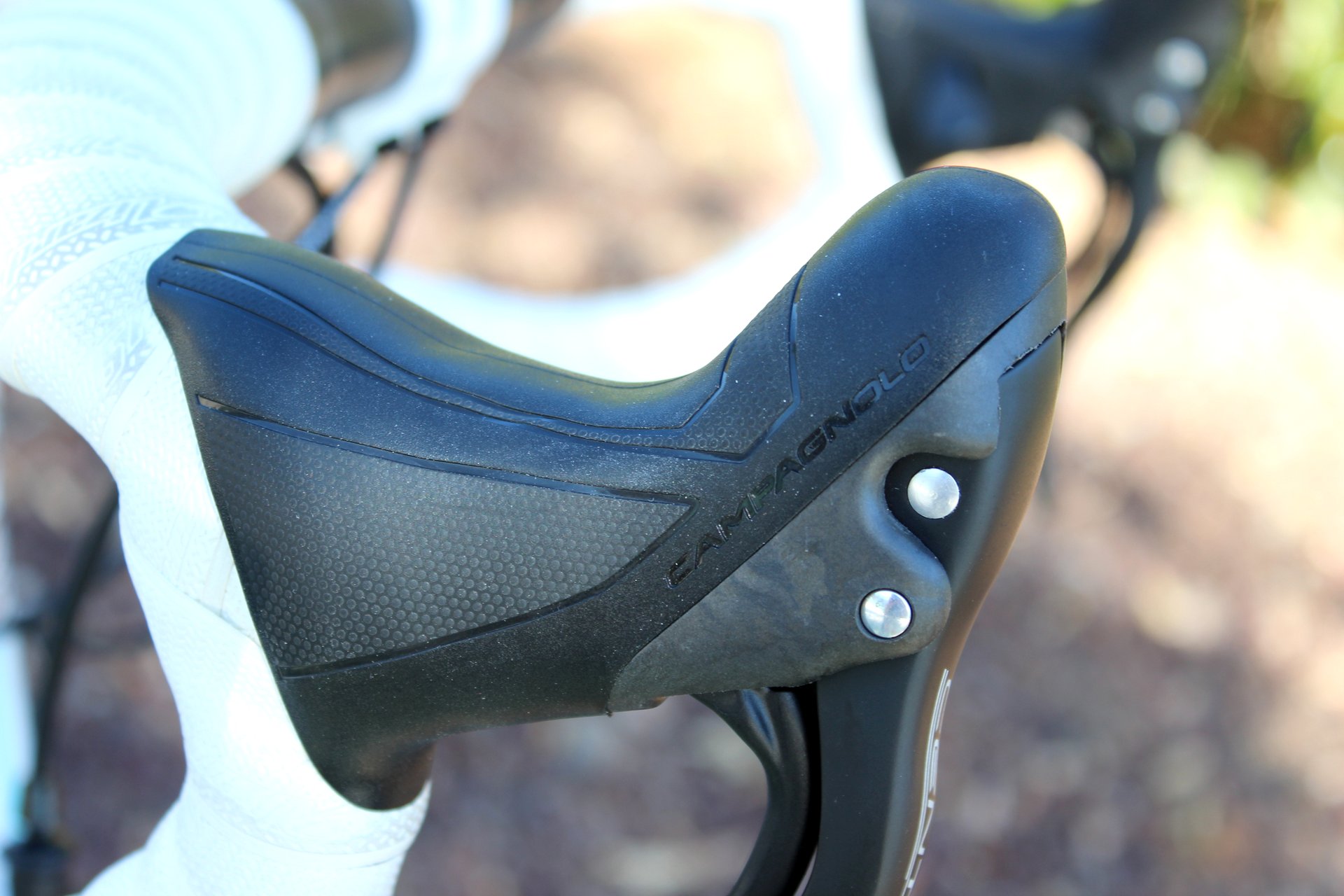 The hoods share the same ergonomics as Potenza and use Campagnolo’s ‘Varicushion’ technology (which is essentially internal cushioning) to try and improve comfort. The surface of the hood is also textured to try and help moisture drain away. Otherwise, the shift levers and buttons are made from a plastic, while the brake levers are aluminium.