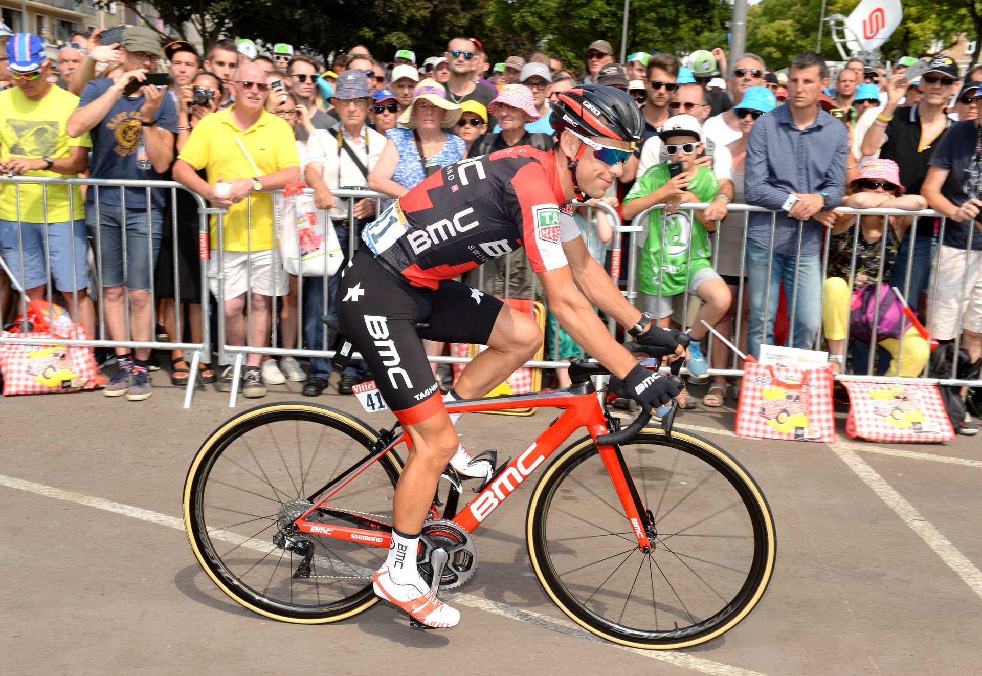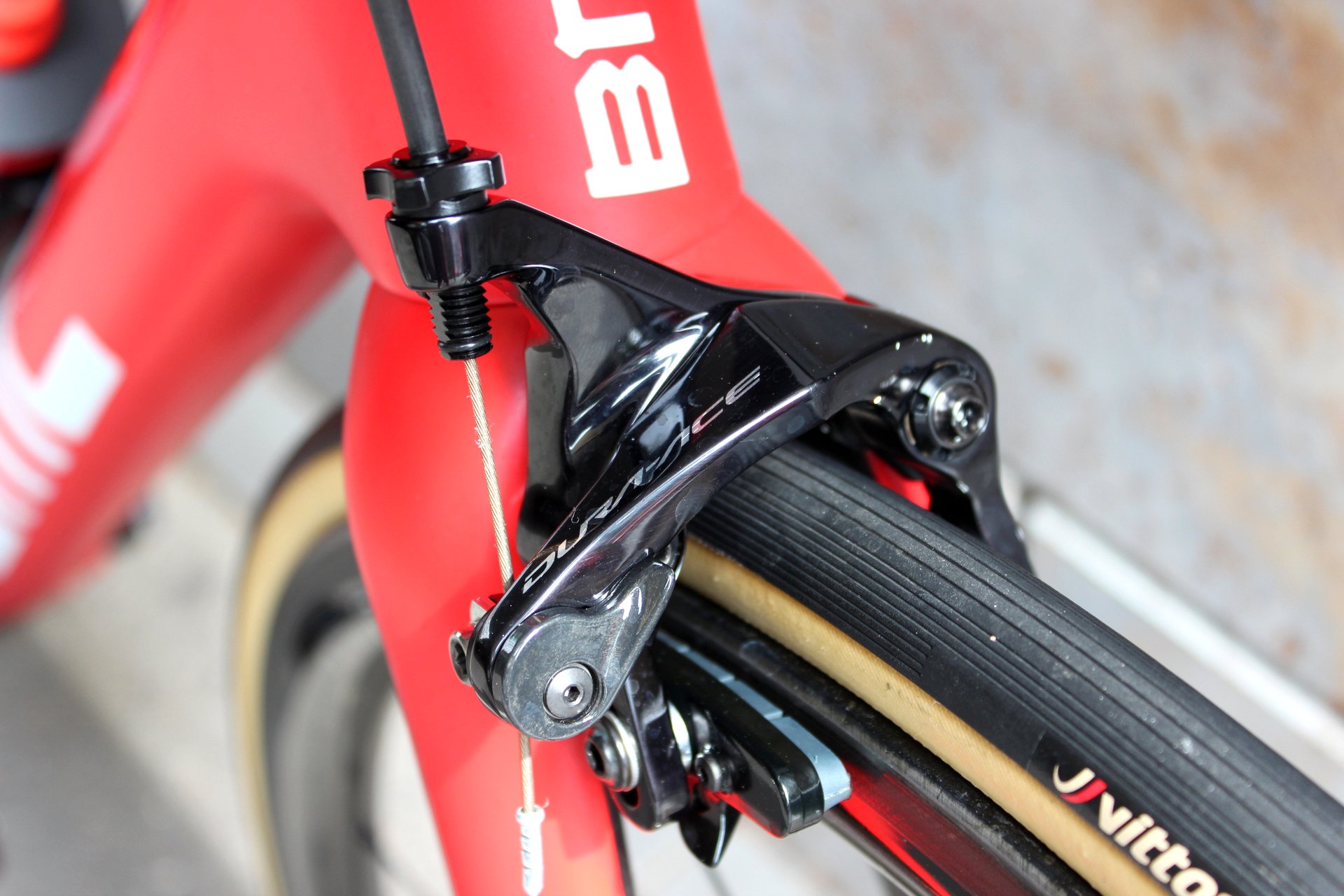 While the Teammachine is now available with either rim or disc brakes, Porte and the rest of his BMC team-mates use the rim brake model – unlike Marcel Kittel (QuickStep Floors), who has won three stages on the Specialized Venge ViAS Disc.