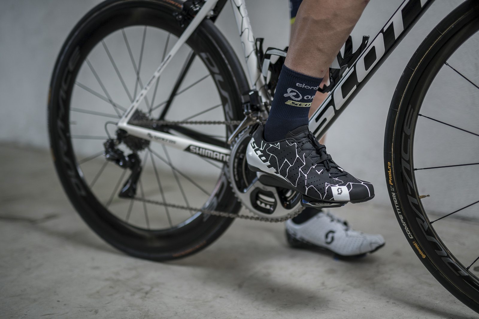 Having succeeded twin brother Adam as the winner of the young rider classification, Simon Yates rode a black and white Scott Addict RC on the final stage. The ‘ying-yang’ design also extended to Yates’ helmet and shoes, also produced by Scott.