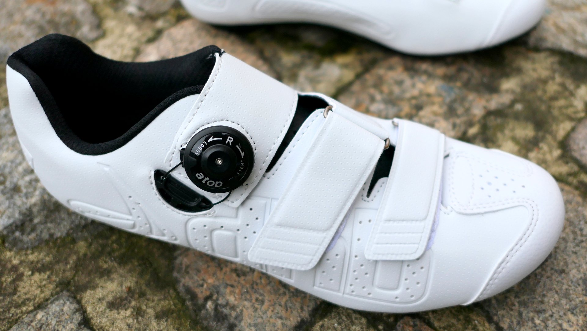 Step up a level and you’ll find two shoes which form part of dhb’s wider, top-end Aeron collection, both built around a full carbon fibre sole. First there’s a £99.99 model with two velcro straps and a ratchet, while that flagship £120 shoe we mentioned gets upgraded to an Atop dial, which offers a micro-adjustable fit.
