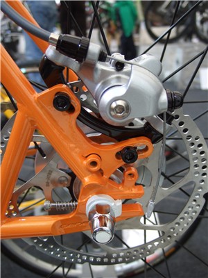 Thanks to fat 700c tyres, the overall effect is of a kind of hub geared, cyclo-cross styled all-rounder, an effect enhanced by the provision of mounting bosses for mudguards and a rear rack. In order to accommodate adjustment for chain slack without the need for an eccentric bottom bracket shell, horizontal rear dropouts are used along with a neat adjustable rear disc mount.