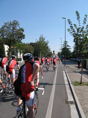 Meeting outside the hotel just after 9am the heat of the day had already started to build. All 200 of us, led by Fausto and his helpers, sailed off en masse on a leisurely 50km spin through the countryside surrounding Treviso.