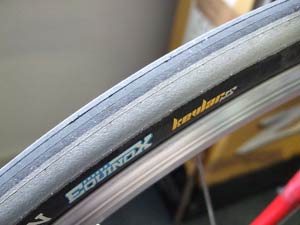 Catalogued in Hutchinson’s ‘Cyclo-tourisme’ range of road clinchers, the Equinox is apparently available in both folding and wire-bead versions; given the price of the tyre and the advantages of a folding bead in terms of weight, ease of fitment and portability, the folding type is the one to choose.