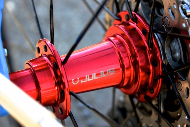 Up front, the construction method and bearing source are identical, but the unit is smaller, as might be expected, and radially laced, rather than with a 2:1 ratio. Julius have named their front hub, which features across its range, the H87, in homage to its claimed 87g heft.