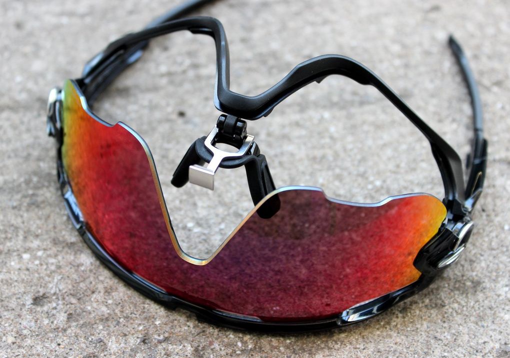 The Jawbreaker name comes from the mechanism which separates the lower half of the frame from the upper to remove and change the lens. Lift the nose clip up, unhook it from the top of the frame, and the lower half swings down on two hinges to expose the lens.