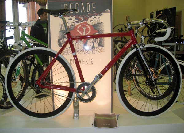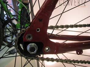 Here’s the Decade Convert2. Based on the popular Racelight T frame, its USP is the Swopout dropouts (borrowed from Upgrade Bikes sister brand DMR) which allow the frame to be run with or without gears. Here it is pictured in full fixie mode.