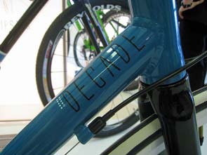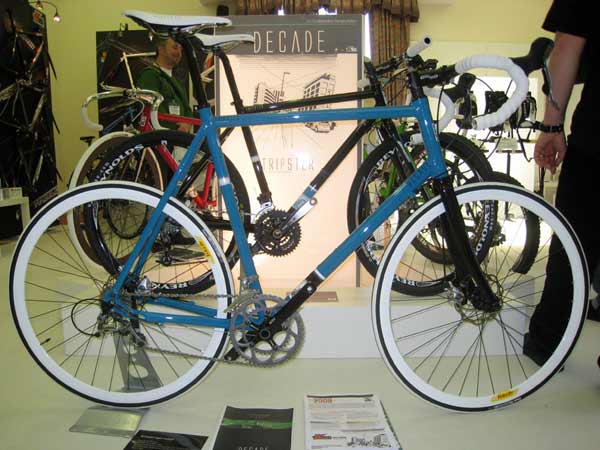 This is the Tripster, a frame that can roll on 700c road wheels or alternatively 26in MTB wheels. The aluminium frame will be mated to a carbon fork and there’s mounts for disc brakes, mudguards and racks – the ideal commuter bike? Perhaps so…