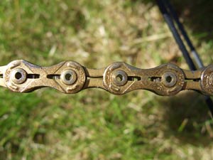 Titanium nitride is widely used where abrasion is a potential wear problem thanks to its exceptional surface hardness. KMC’s X9 SL chain is not only coated in the stuff but has slotted inner and outer side plates to save weight. It comes in at an undeniably svelte 240g for 116 links, allowing KMC to claim it to be the lightest nine-speed chain there is. As the name implies, it is designed for a nine-speed transmission; its X10 SL sibling is identical but for the narrower width required for 10-speed operation. Both are said to work equally well on Campagnolo and Shimano transmissions.