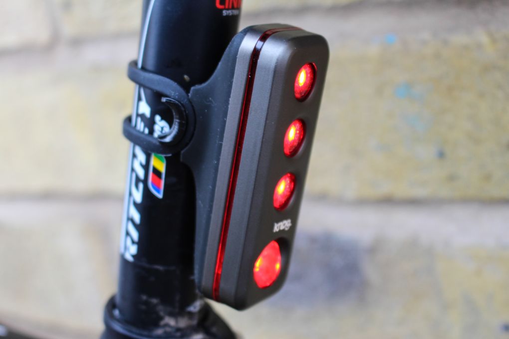 Knog’s range hierarchy seems a little, well, anarchic in all honesty, as there are multiple versions of the Blinder rear light. This Blinder Road R70 is described as being particularly designed for roadies, and one part of that is its compatibility with aero seatposts. Aero posts are a particular challenge for rear lights because their sharp trailing edge makes it hard to mount anything that doesn’t have a similarly skinny mounting area. The tricky bit comes in finding something that’ll work with both aero and conventional posts as the differences between the two are stark enough that finding something to fit both is a challenge. Knog have found a way round this by effectively adding an additional little channel into the mount of the Blinder Road R70, which fits against the edge of aero posts, as well as a longer rubber mount to fit around the larger profile.